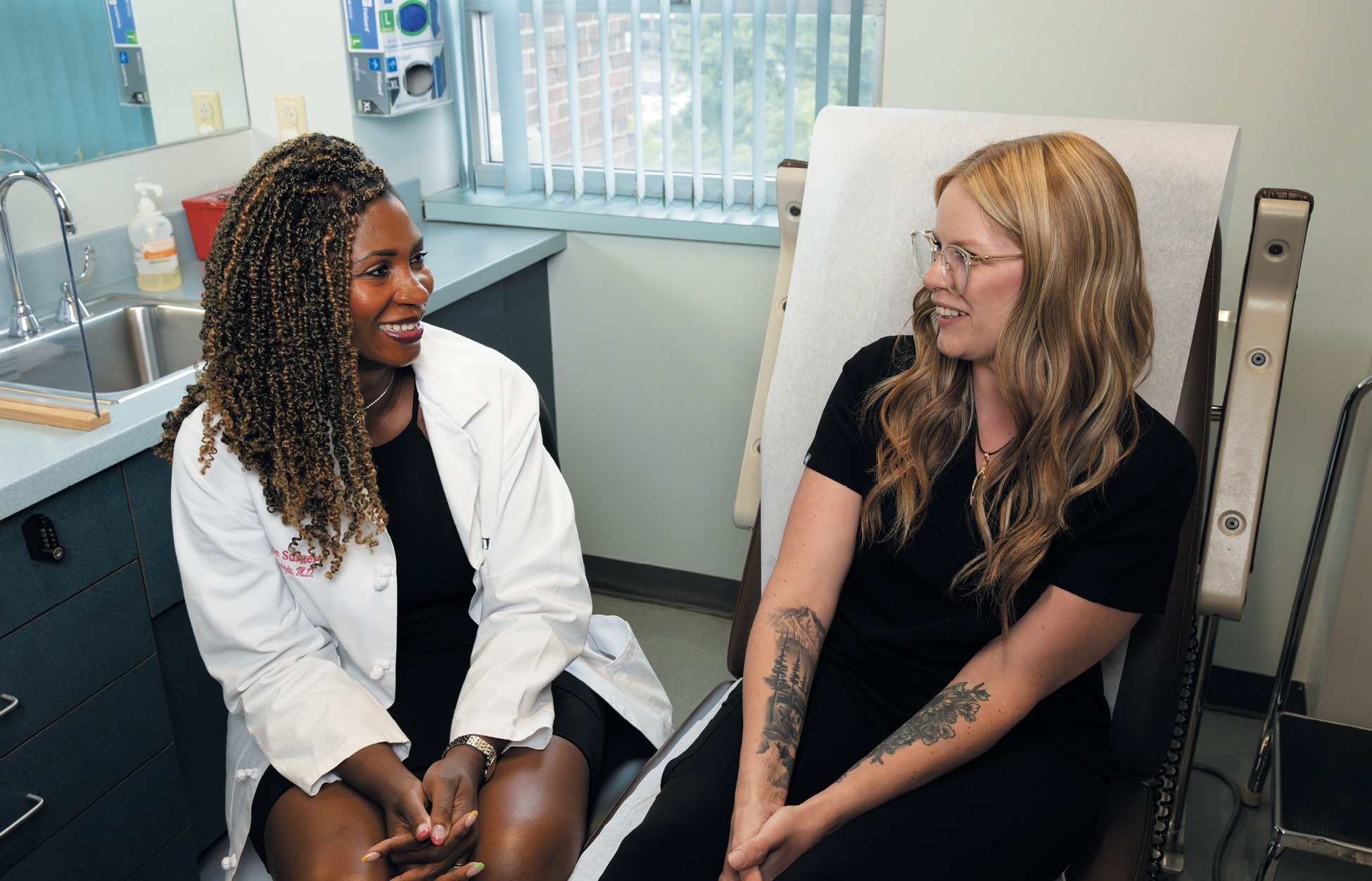 Omotinuwe Adepoju, MD, consults with a patient about her preferences for breast surgery.